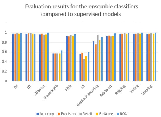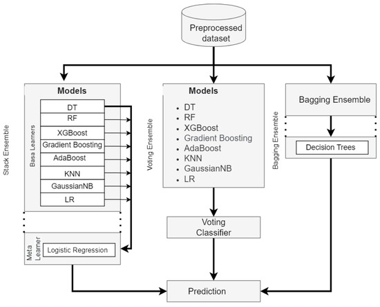 We used the supervised models’ preprocessed dataset (Section 4.1). As seen in Figure 4, we also implemented three ensemble classifiers: voting, bagging, and stacking. Accuracy can be improved through implementing processes that enable the working together of multiple ML algorithms on a single ensemble classifier prediction. The single-ensemble-platform integration of a diversified set of the classifiers used in (Section 4.1) can help enhance the system’s overall classification accuracy.