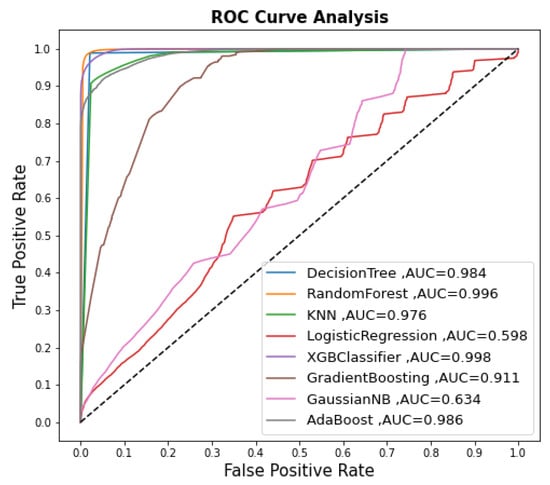 As shown in Table 5, the RF and DT models had the highest accuracy of 98.3%, followed by the XGBoost model, which had an accuracy of 97.0%. The GaussianNB and LR models were the least accurate, at 57.3% and 56.8%, respectively. KNN, AdaBoost, and Gradient Boost provided good accuracy: 93.4%, 93.3% and 82.6%, respectively. After applying correlation feature selection, we found that the majority of input features had a low correlation with the target variable. The Logistic Regression model achieved low accuracy. On the other hand, the Random Forest model achieved high accuracy because it has its own feature selection. Figure 5 shows the ROC results of the developed supervised models.