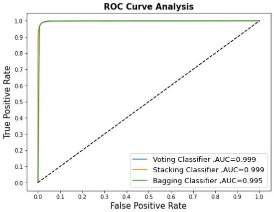 The main aim of this research was to design an effective machine learning-based IDS scheme for binary classification that utilizes eight supervised ML models, along with ensemble classifiers. The developed supervised ML models were Gradient Boosting, GaussianNB, k-NN, LR, RF, AdaBoost, DT, and XGBoost. These models were fine-tuned and data-balanced. The most accurate models were the Random Forest, Decision Tree, and Xtreme Gradient Boosting Classifier. The ensemble learning strategy is superior because it allows learning mechanisms with varying capabilities to support each other. Table 6 shows a summary of the quantitative performances of the three ensemble classifier models. These were stacking, bagging, and voting classifiers. Compared to the single models, the proposed ensemble classifier models improved the performance. Stacking showed effective performance through scores of 0.984 for accuracy, 0.980 for precision, 0.989 for recall, and 0.984 for F1. Stacking is a two-stage procedure. In the first stage, it has eight model-based learners (Gradient Boosting, GaussianNB, k-NN, LR, RF, AdaBoost, DT, and the XGBoost classifier). The second stage is a meta-learner with one model (Logistic Regression). Stacking utilizes these two stages to learn and discover how to best combine the single models in the base learners with the meta learners. When compared to bagging, stacking showed high scores for precision, recall, and ROC. When compared to voting, stacking showed a high score for recall. The ROC curve was plotted, and the area under the curve (AUC) was calculated to evaluate the intrusion detection performance. The ROC is a graph that compares the true positive rate to the false positive rate at varying thresholds and is used to illustrate a binary classifier’s ability to differentiate between two classes (normal and malicious messages). Figure 6 depicts a high ROC value, which indicates that the ensemble classifiers are effective at solving the CAN bus intrusion detection problem.