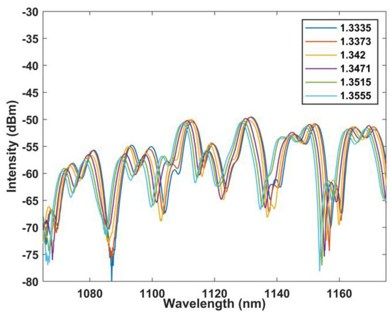 In addition, the RI response characteristics of the designed MZI structure are analyzed. The results are shown in Figure 11 and Figure 12. Within the RI range of 1.3335–1.3555, the wavelength moves to shorter wavelength, and the corresponding response sensitivity is −144.758 nm/RIU, with a linear fit up to 0.992.