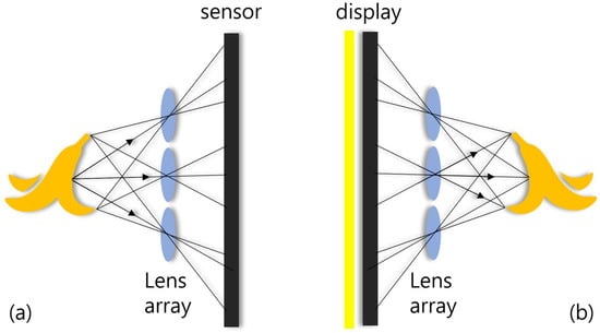 To visualize natural 3D scenes, integral imaging was reported by G. Lippmann in 1908 []. Integral imaging provides full color and full parallax 3D images with multi-perspective elemental images. Figure 1 illustrates an overview of integral imaging. As shown in Figure 1, integral imaging generates 3D images by two sequences: image acquisition and reconstruction. Image acquisition provides multi-perspective elemental images from different locations of the lenslets. In the reconstruction, there is an optical method (Figure 1b) and a computational method (Figure 2). In the optical method, the 3D image is displayed by backpropagating the elemental image through the same lenslet array. In the computational method, as shown in Figure 2, a nonuniform volumetric computational reconstruction (VCR) is utilized. It uses different shifting pixels for elemental images through various reconstruction depths and superposes them. It can be described as follows []