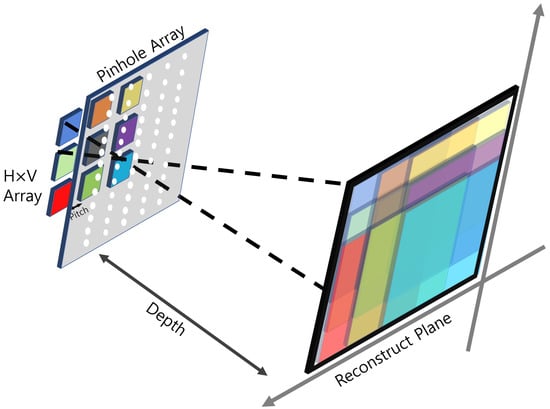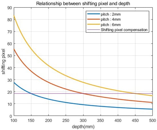 k is the merged constant value of , , and f. In Equation (10), shifting pixels () are considered by pitch () and depth (). Figure 7 illustrates the relationship between the shifting pixel, pitch, and depth. As shown in Figure 7, the number of shifting pixels gradually decreases as the depth increases. However, in Figure 7, the shifting pixel can be compensated by using a higher pitch. Therefore, a higher pitch is used for the longest pickup plane to compensate for the lack of shifting pixels. Then we reconstruct the elemental images by considering various shifting pixels and the relative magnification ratio. It is described as follows: