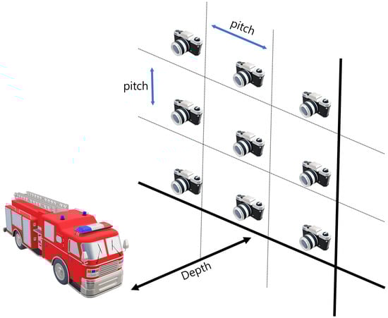 To visualize 3D images with enhanced lateral and longitudinal resolutions, we merged the SAII, ADS, and VCR techniques in this paper. In elemental image acquisition, we set the camera arrays at different pickup planes with different lateral perspectives. Figure 6 illustrates the alignment of the camera array in our method. As shown in Figure 6, elemental images with different perspectives are recorded per pickup plane. On each pickup plane, different pitches among cameras are considered. In Equation (1), the shifting pixels of each elemental image can be decided by the number of pixels (), pitch (), focal length (f), sensor size (), and depth between the pickup and reconstruction plane (). However, the number of pixels, focal lengths, and sensor sizes are constant values when the camera and lens are chosen. Thus, in this case, the shifting pixel can be described as follows