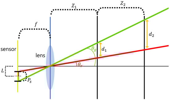 Synthetic aperture integral imaging (SAII) is an elemental image acquisition technique. Unlike lenslet array-based integral imaging, SAII utilizes a full sensor for capturing each elemental image. Therefore, 3D images by SAII can have high resolutions. Figure 3 illustrates the SAII. As shown in Figure 3, it fixes the distance between the 3D object and the pickup plane and generates the elemental images by moving the image sensor on the pickup plane with the same pitch. However, 3D objects by using elemental images with single distances may not be visualized well due to the limited resolutions. Figure 4 illustrates the resolution problems of 3D image visualizations. In Figure 4, is the pixel size, f is the focal length, is the distance between the sensor and 3D scenes, L is the distance between the center of the sensor and pixel, are the angles of the red and green rays, and is the distance where we recognize a pixel as single information. It can be described as follows: