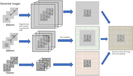 Figure 8 illustrates the procedure of our computational reconstruction. In the procedure, we needed to calculate the relative magnification ratio for every elemental image and resize all elemental images considering this magnification ratio (). Then, we calculated the shifting pixels () and assigned them to every elemental image. For convenience, in the reconstruction sequence, we applied zero padding with () sizes to every elemental image. Finally, 3D images with enhanced lateral and longitudinal resolutions can be reconstructed.