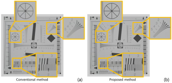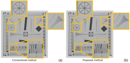 To prove the feasibility of our method, we implemented a simulation using ‘Blender’. Figure 9 illustrates the simulation setup and 3D scenes, where 5(H) × 5(V) camera arrays for each (different) depth are used, the focal length is f = 50 mm, the pitches of the camera arrays are 6, 4, and 2 mm, to set the same pitch for each pickup plane (Figure 7), the sensors size is 36(H) × 36(V) mm, and 1000(H) × 1000(V) is the number of pixels used for recording each elemental image. The conventional method only used the elemental images at the furthest pickup plane to reconstruct the 3D images. We used a resolution chart [] as the object to prove the feasibility of our method.