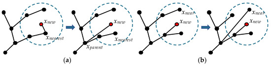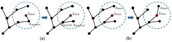 In the ChooseParent procedure, RRT* searches for a vertex in a hypersphere of a specific radius centered at xnew such that the path through this vertex to xnew has the lowest cost. It is then used as the parent vertex of xnew, as shown in Figure 1a. In the Rewire procedure, the vertices in the hypersphere are represented by xnear in turn. Compare the cost of the current path to xnear with the cost of the path through xnew to xnear until every vertex in the hypersphere has been compared. During each comparison, if the path through xnew is less costly, change its wiring, as shown in Figure 1b. Algorithm 2 shows the ChooseParent procedure, and Algorithm 3 shows the Rewire procedure.