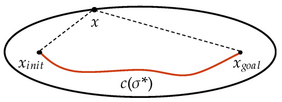 where x is the random sample, σ* is the best path with the minimum cost at the current time, is the cost of σ*, and is the Euclidean distance between x and y. Figure 2 shows the hyper-ellipsoid set by Informed-RRT*. When the current best solution is updated, its cost is also updated. Therefore, the sampling region, i.e., the hyper-ellipsoid, gradually becomes smaller, and the probability of the sample being on the optimal path is greater.