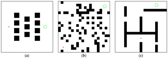 M-RRT* is compared with the above three algorithms in three environments of the same size of 100 × 100. The simulation environments are shown in Figure 8. Each algorithm was run 100 times because of the randomness of the sampling-based algorithms. The system and resource characteristics used in the simulation implementation are shown in Table 1.