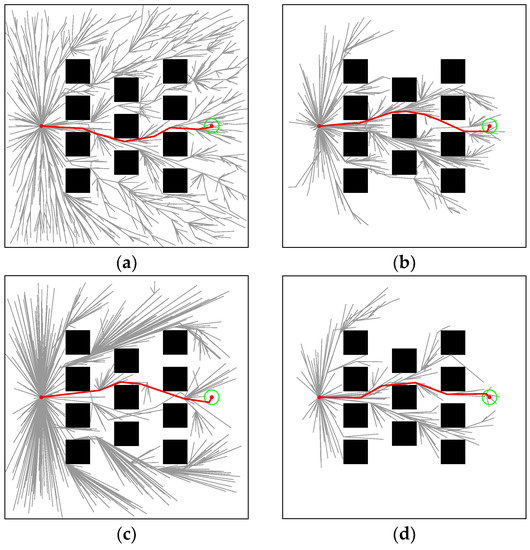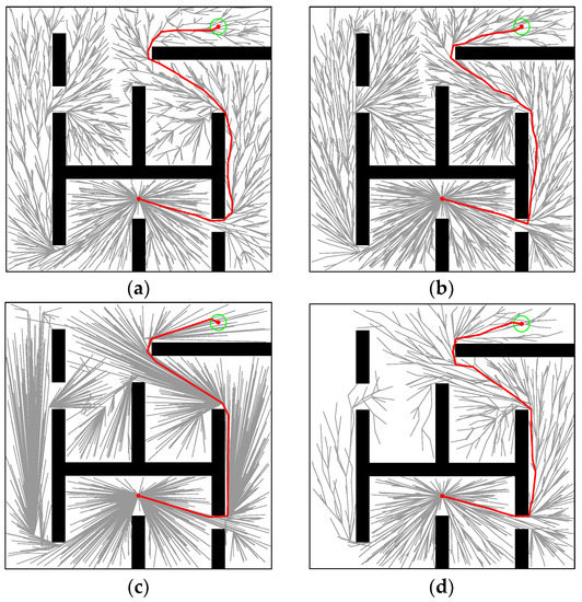 The maze is shown in Figure 8c. In Figure 15, the paths generated by RRT* (tinit = 0.2163, T5% = 4.1688), Informed-RRT* (tinit = 0.375, T5% = 14.4523), Q-RRT* (tinit = 0.8908, T5% = 1.5375), and M-RRT* (tinit = 0.0647, T5% = 1.3433) are shown. In the maze, loptimal = 138.6089. It can be seen that Informed-RRT* always performed global sampling like RRT*. Thus, Informed-RRT* has no advantage in this environment. Q-RRT* optimized paths more efficiently in the maze. On the contrary, due to the two vertex acceptance criteria proposed in this paper, M-RRT* rejected a lot of inferior vertices and obtained the solution with fewer vertices.