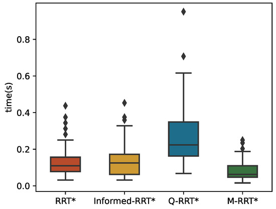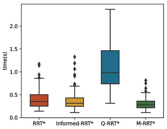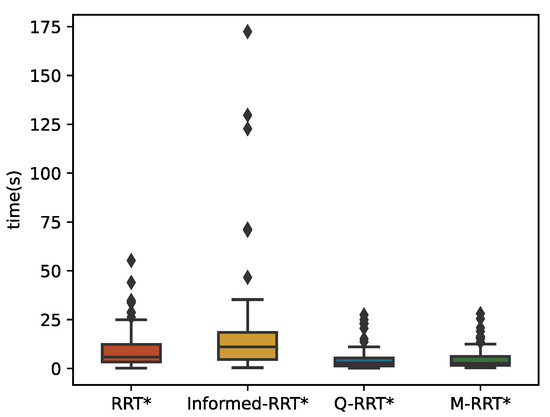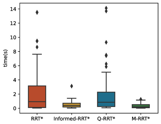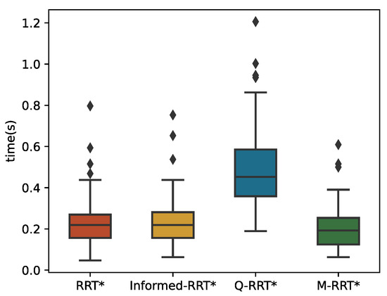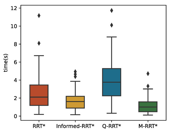 The 100 simulation results of tinit and T5% are described by boxplots, as shown in Figure 10 and Figure 11, respectively. Table 2 counts the specific numerical values of the simulation results. For the convenience of the comparison, the data in the table are generally displayed to the fourth decimal place. If the size of the same indicator for the algorithms is very close, it shows the decimal place where their numbers are different. The two minimum values of the three algorithms are the same because the length of the initial path is less than 1.05∗loptimal. Due to the regular distribution of obstacles in this environment and the small distance between the initial and goal states, the above situation is common for sampling-based algorithms. Although RRT* and Informed-RRT* have identical procedures for finding initial solutions, they are less stable, as shown in Figure 10. Since Q-RRT* consumes more computing resources on the optimized path, it takes a long time to find the initial path. In addition, M-RRT* takes less time to find the initial solution. It is clear from Figure 11 that M-RRT* converges faster than the other three algorithms. Based on the above analysis, M-RRT* outperforms RRT*, Informed-RRT*, and Q-RRT* in the regular environment.