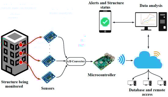 SHM systems comprise the following parts. The first is a network of sensors that collects essential data to determine the structure’s response under seismic activity. Once this data is obtained, it is passed to the next part, which includes a microcontroller or device that receives the data from the sensors. The microcontroller transforms these data into digital information. Then, it sends it to the next part: a data analysis algorithm that processes the signal to acquire characteristics and value parameters. These parameters are used in the last part, constituting the identification and evaluation of damages. This identification is used for generating alarms, notifications, reports of structural health, or even activating an action plan with a separate system. Everything explained is with a general approach as an introduction to SHM systems. Therefore, these parts are deepened in Section 2.2, Section 2.3, Section 2.4 and Section 2.5, exposing their available tools and more characteristics.