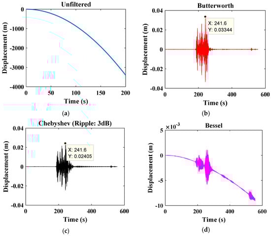 Filtering of the displacement signal (a) without filter, (b) Butterworth filter, (c) Chebyshev filter, and (d) Bessel filter.