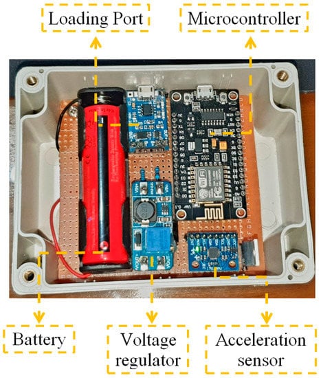 Within the sensors used in SHM systems, there are several categories where they have microelectromechanical accelerometers (MEMS), piezoelectric accelerometers (PZ) [51], weight sensors, “Fiber Bragg Granting” sensors (FBG) [52], geophones, displacement sensors, humidity sensors, and variations. Specifically, sensors such as ADXL345, ADXL335, ADXL322, Colibrys MS9002, piezoelectric 393B04 PCB, piezoelectric 301A11 PCB, and SDI 1521 have been used.