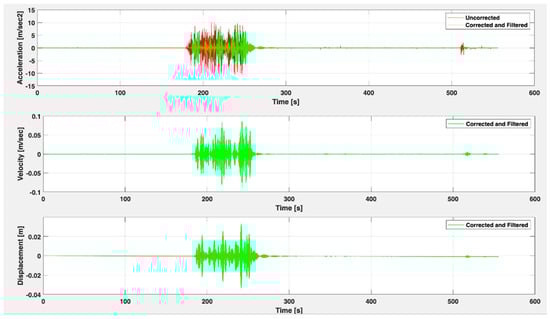 Note that the displacement results from the double integration of an accelerometer signal. Within this example, the way noise can affect the displacement signal is notorious, presenting inadequate values and leading to an erroneous interpretation of the data since the filtered signals suffer from slight movements or almost no displacement while remaining stable. However, when integrated twice, the raw signal increases the amplitude of its noise since these are added as time passes, resulting in a disproportionate displacement signal compared to the results obtained with the filtered signals. Filters such as Butterworth, Chebyshev, Bessel, Ormsby, Bartlett, Hanning, and finite impulse response [67] are usually used to eliminate this noise.