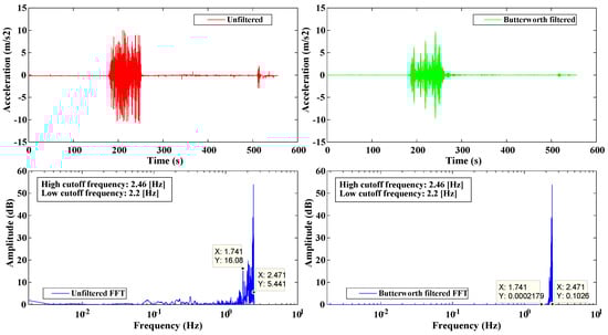 Noise filtering in the accelerometer signal is vital since the noise is significantly amplified when performing a double integration. Therefore, even if there is a slight initial noise, there will be a significant noise that noticeably alters the structure displacement signal affecting its interpretation. In this regard, there is high-frequency noise called micro-earthquakes (micro tremors) from 0.5 Hz onwards. There are also low-frequency noises called microearthquakes (microseisms), which are less than 0.1 Hz [65]. Similarly, when integrated twice, the same white noise becomes a phenomenon called “random walk”, which is characteristic of increasing its amplitude over time [66].