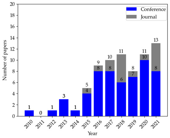 The search process can be seen in Table 3. We calculated statistics based on the final selected papers and plotted a graph from three aspects: year of publication, and number and source of papers. Figure 2 depicts the distribution of papers by source from 2010 to 2021. We can see a significant increase in articles on the target topic starting in 2015 due to Miller and Valasek’s remote control of a Jeep that led to the recall of 1.4 million vehicles, drawing public attention to automotive cybersecurity.