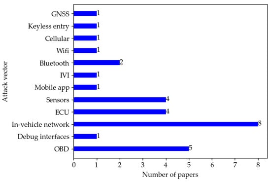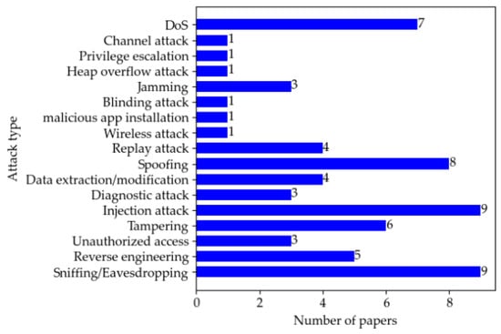 A brief comparison of penetration testing in the surveyed literature from the perspectives of attack vectors, attack types, and knowledge level (■ = Black box, ☐ = White box, 🞕 = Grey box) can be found in Table 7. Figure 4 and Figure 5 show the distribution of papers by attack type and vector. In the surveyed literature, sniffing/eavesdropping and injection attack are the most used, followed by spoofing, and DoS is the third. As for the attack vector, the in-vehicle network is the most commonly used attack entry point for penetration testing as it undertakes critical communication tasks inside the vehicle.