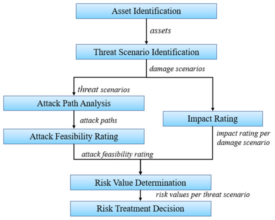 TARA serves as the core of risk-based testing. TARA results include threat identification, probability and impact of threat scenarios, and risk values. Using the risk assessment results can help prioritize test cases and test execution. In the past, risk assessment was not an activity in automotive development. However, with the promulgation of SAE J3601 and ISO/SAE 21434, risk-based security activities have been introduced throughout the automotive cybersecurity development process. The standard also provides a TARA methodology for OEMs and suppliers to implement, as shown in Figure 8. Moreover, based on the research literature, Table 9 describes several security analysis methods and techniques in the automotive domain. It also compares the threat models. In addition, whether the analysis method involves safety and security is considered.