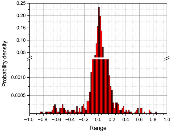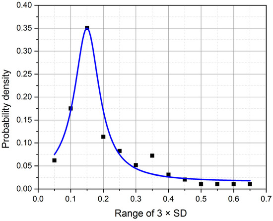 Ninety-seven case studies showed that this value (Table 1, 3 × SD of the ratio of adjacent RRI) varied around 1 from 0.05 to 0.64 with an average of 0.18 ± 0.11. Figure 2 shows that the 3 × SD value is distributed around this average. This indicates that the upper value of the criterion is very close to 1.18 ± 0.11, and the lower value is 0.82 ± 0.11 (1.0 − 0.18 = 0.82). Before the beginning, the artifact elimination procedure of the first-order AR simulation must be performed, and the selection of the exact coefficients is required (Figure 2). The distribution of moments of noise generated by AR simulation is asymmetric and depends on the number of artifacts (Figure 2 and Table 1). Visually, in a separate example, the noise distribution is clearly visible (Figure 3). The values observed on both sides of the average are attributed to artifacts (±3 × SD = 0.18 ± 0.11).