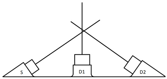 We applied the method to calculate explained in the previous subsection to the DS instrument [4], consisting of an IR source (S) and a forward (D1) and backward (D2) detectors located at specified scattering angles (Figure 4). The geometric parameters (positions and orientations of the emitter and the detector) for both configurations can be found in Appendix B. Each detector encompasses two different spectral bands in the range of 1–3 and 3–5 . The thermal source emits in a similar way to a blackbody with a peak emission of 3.29 . To avoid thermal noise, the instrument implements lock-in amplification [20].
