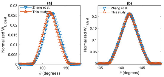 Angular weighting functions of the dust sensor for both configurations as a function of the scattering angle (). (a) using Equation (8). (b) using the Equation (9).