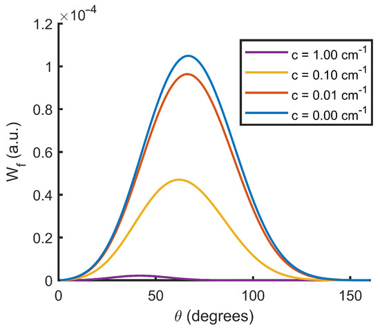 Angular weighting function () as a function of the scattering angle () for different attenuation coefficients (c).