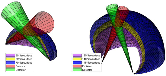 Figure 10 shows the different scattering angle isosurfaces (for a fixed S and D) and the ideal (conical) FoV of the emitter and the detector. The intersection volume between the detector and emitter cones shows the volume where the is measured. The smaller the volume of the intersection, the more similar the isosurfaces will be to the planes (within that volume).