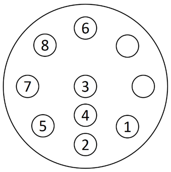 Stoichiometric calibration was conducted using materials with various effective atomic numbers. The tissue-equivalent rods were inserted into a phantom (Multi-Energy CT Phantom, Sun Nuclear Co., Middleton, WI, USA). Figure 1 illustrates the phantom used in this study, and Table 1 shows the effective atomic number and relative electron density of the various phantom materials. The rod located in the phantom number in Table 1 is located in the same location as in the phantom number in Figure 1. Adipose has the lowest atomic number, with an effective atomic number of 6.44, and cortical bone has the highest effective atomic number of 13.29. The majority of human tissue has an effective atomic number between adipose and cortical bone.