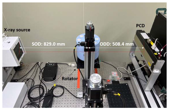 Figure 2 illustrates the components of a PCD-CT, which include a detector, a source, and a rotating platform. In terms of detectors, PCDs (XC-TDI, Varex imaging, UT) are made of cadmium telluride (CdTe) with pixels of 100 μm in size and 100 μm in pitch. It has a matrix of 3584 × 60 pixels, and the active area is 360 × 6 mm2, arranged as a line detector. This detector operates only in the photon counting mode, and the X-ray energy spectrum can be divided into two bins. The X-ray source (RAD-14, Varian Medical Systems, UT) was installed perpendicular to the detector surface. A tube voltage of up to 150 kV can be applied to the source, which is a rotary anode type. A rotating platform is located between the source and the detector. A subject may be placed on the platform, and may rotate while a source and detector are fixed in order to obtain a CT image. The source-to-object distance (SOD) is 829.0 mm and the object-to-detector distance (ODD) from the detector is 508.4 mm.