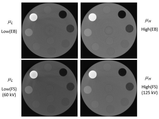 Figure 1 shows a phantom that was scanned with dual energy and reconstructed using the Feldkamp–Davis–Kress (FDK) algorithm and Hann filter. A photon counting method was used to acquire the image. We obtained two data sets in order to confirm the energy bin effect of the photon coefficient detector. First, photons were measured in two vacant regions within one spectrum. Then, 125 kV X-ray spectrum energy bins (EBs) were divided into low-energy (20–60 keV) and high-energy (60–125 keV) regions in order to ensure that the number of photons was similar. A value of 20 keV or less was not used due to the increased noise. The second method involved scanning twice with FS mode to obtain a dual-energy image. Low- and high-energy outputs were powered by 60 kV and 125 kV voltages, respectively. Figure 3 shows images scanned in EB and FS modes. A linear attenuation coefficient was used to express the pixel value of the image. The EAN and RED images obtained by the EB and FS methods were extracted using Equations (5) and (6).