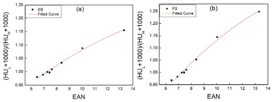 Stoichiometric curve fitting results as a function of effective atomic number (EAN) and the linear attenuation ratio for (a) energy bin (EB) and (b) full spectrum (FS) mode.