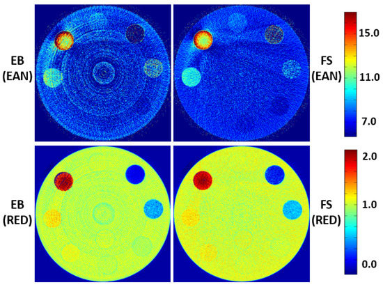 Figure 5 shows the tissue-equivalent materials of the EAN and RED images. The upper line in Figure 5 represents EAN and RED images acquired in EB mode. The lower line in Figure 5 indicates EAN and RED obtained in FS mode. In Figure 6, the theoretical and experimental values of EAN and RED are illustrated in a graph.