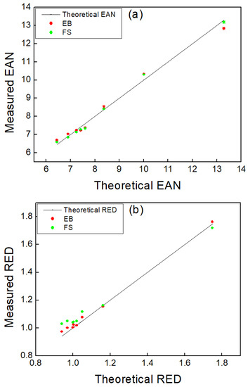 Figure 6a shows EAN obtained in the EB and FS modes. In EB mode, comparing the measured EAN with the theoretical value, the deviation was between −3.42% and 3.95%. The average error was 2.48% and the standard deviation was 1.23%. In FS mode, the measured EAN deviated from the range of −3.49% to 2.93% compared to the theoretical value. The average error was 2.04% and the standard deviation was 1.03%. As shown in Figure 6b, RED was calculated using the EB and FS methods. In EB mode, as compared to the theoretical value, the measured RED varied between −0.65% and 3.57%. The average error was 1.68% and the standard deviation was 1.35%. In FS mode, the measured RED varied from −1.64% to 9.55% compared to the theoretical value. The average error was 4.58% and the standard deviation was 3.26%.