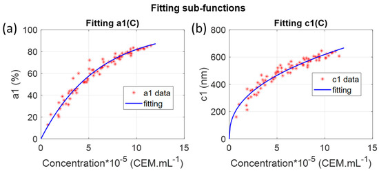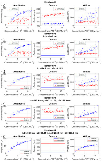 Iterated fittings showed that it can be approximated that only the amplitude and the width of the first Gaussian evolved with the concentration. As already mentioned, the second Gaussian should be considered as a baseline. was described with a power function. This function cannot be related to any light–matter interaction process and another function could have been used instead. was fitted with an exponential function. This function led to the best adjustment efficiency with R2 = 0.96. This exponential function was chosen because the evolution of with the concentration was very similar to the evolution of the maximum value [30]. This exponential equation was directly derived from the Beer–Lambert law. Both ‘a’ parameters were very close: 7.5 × 10−7 [30] and p1a1 parameter equal to 7.45 × 10−7 in the present study. This showed that the concentration related principally to the absorption amplitude. This was also observed by the fact that the aspect of was conserved throughout the successive fittings (to be compared to the evolution of for example). Previously, the position of spectra maxima was shown to evolve with concentration [30]. In the case of Figure 3e only, this should not happen because the centers of both Gaussians were fixed. However, looking at successive iterations (Figure 3), it was clearly seen that slightly evolved with the concentration, which was in accordance with what was observed before. This evolution was lost when considering as a constant. However, this was compensated by the fact that the dispersion of strongly decreased with successive fittings. Indeed, considering not constant would have kept more dispersed, and the overall fitting R2 would not have been improved. We decided to simplify the mathematical expression of by considering constant.