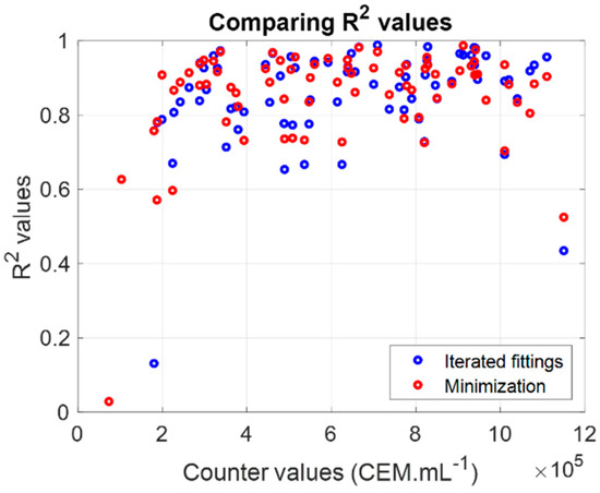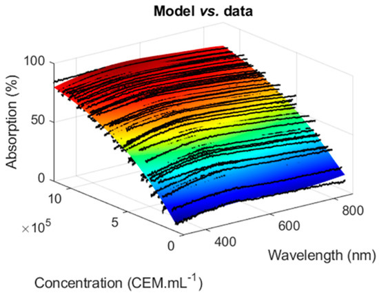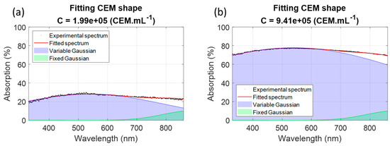 Both sets could describe the experimental CEM spectra efficiently (Figure 7) since the R2 values obtained when fitting experimental spectra with Equation (5) using either parameters from fitting or from minimization were quite similar, with slightly higher R2 values with the minimization algorithm. Moreover, it seemed that the shape fitting was inefficient for extreme concentration values. The CEM spectral model given by Equation (5) was used to compute concentrations and to compare results to measurements performed with the automatic cell counter.