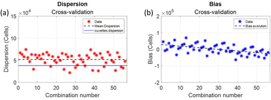 The average dispersion was equal to 5.2 × 104 cells (dashed black line in Figure 9). It was slightly higher than what was calculated globally and represented about 8.7% at the center concentration range (still acceptable). The bias results were more surprising since the bias value decreased with the combination number as detailed in Figure 10.