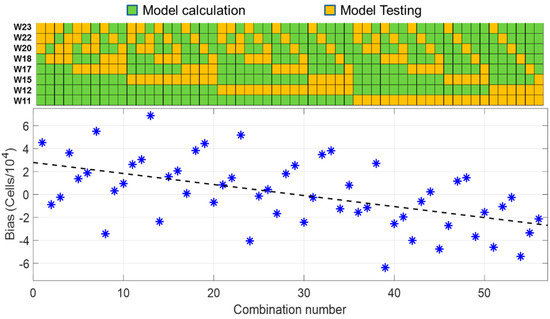 Positive bias values corresponded to “model data” mostly recorded during the 4 first weeks (W11 to W17) and “data sets” mostly recorded during the last 4 weeks (W18 to W23), and vice versa for negative bias values. The average bias over the period was 622 cells, the same virtually zero value as the one calculated globally.