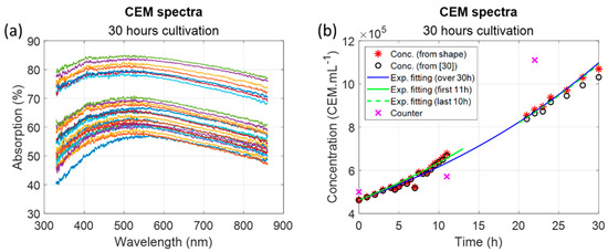 The accuracy of the CEM spectral model was about 13%. This value will be discussed later regarding the dispersion due to plastic spectroscopy cuvettes. The model was applied to monitor the evolution of the concentration during a 30-h CEM cultivation experiment.