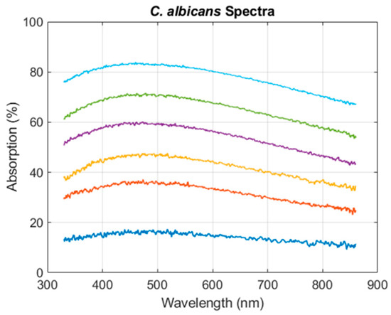 The 80 CEM spectral data were recorded into a text file and then transposed to Excel. The data obtained in transmission were converted into absorption percentages, and all calculations were performed using MatlabTM R2020b software, USA, supplier France. Only wavelengths between 330 nm and 860 nm were considered to remove measurements with high background noise. Artifacts due to energetic emission peaks of the deuterium lamp were numerically removed. Regularly, absorption spectra of neutral densities (THORLABS, USA, supplier France, NE05B and NE10B) were recorded and compared to the supplier’s data to ensure correct absorption spectra measurements. A home-developed spectra quality estimator (unpublished data) was used to remove badly shaped spectra. A total of 75 CEM spectra were used in this paper. The same protocol was used for Candida albicans (hereafter CA) spectra. Seven CA spectra were used in this study for demonstration purposes. In this study, the absorption spectra are defined as: