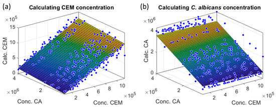 Seventy-five CEM spectra were used to construct the shape model, which was therefore quite representative. Conversely, only six dilution ranges of Candida albicans were used explaining that the shape model could be less accurate. Moreover, the absorption spectra of yeast and mammalian cells were quite similar. This made the fitting of both species quite difficult and reduced the accuracy of the result because of the crosstalk between each species’ measurements. The parameters given in Table 4 allow an understanding of the effect of shape similarity on the results. Concerning the CEM mean plane, was related to the contribution of CA. It should be zero while should be equal to 1. This was not exactly the case because = 0.04 and = 1.029. This means that the CEM calculation was slightly influenced by CA.