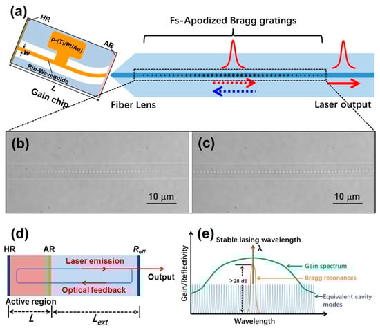 (a) Structure diagram of the semiconductor laser. (b) Example of the Fs-apodized FBG with different refractive index distributions prepared by energy modulation. (c) Microscopy of the Fs-apodized FBG in the middle of the fiber. (d) Working principle diagram of the equivalent resonator. (e) Schematic diagram of the fiber grating frequency selection.