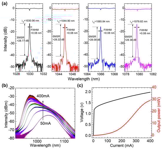 This scheme can achieve many different wavelength single frequency laser seed sources and increase the range of spectral beam combination by using a QD chip with a wide gain spectrum [,]; the length L of the chip is 1.5 mm, and the ridge width w is 5 μm. The ridge waveguide is bent by 7° near the front end to eliminate the influence of the cavity effect. The chip has a specified high reflectivity (HR) of 90% at the rear facet to abate the loss in the resonator, reduce the threshold and increase the output power, while the anti-reflectivity (AR) coating at the front facet has a value less than 0.01% to minimize the influence of the internal cavity mode of the chip. There are 4 layers of the AR coating, and the materials are Al2O3 and TiO2. The ASE spectrum of the gain chip is tested by an optical spectrum analyzer (OSA) (AQ6370B, Yokogawa, Tokyo, Japan) with a resolution of 0.02 nm, as shown in Figure 2b. The peak of the gain spectrum blueshifts from 1050 nm to 980 nm by approximately 70 nm as the injection current increases, the gain peak tends to be stable without a lasing peak, and the gain at 1030 nm is always higher than that at 1080 nm. The voltage and output power versus injection current (power−current−voltage (P−I−V)) characteristics of the gain chip are shown in Figure 2c; the figure shows that the lasers can achieve a power output of nearly 30 mW at 400 mA.