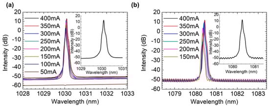 Laser spectrum of the (a) 1030 nm and (b) 1080 nm lasers under different currents. The inset shows the laser spectrum of the corresponding lasers under a current of 400 mA.