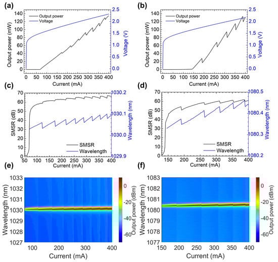 The P−I−V curves of the (a) 1030 nm and (b) 1080 nm lasers. (c,d) show the changes in wavelength and SMSR versus the injection currents. (e,f) are the jet color maps of the laser spectra with injection currents.