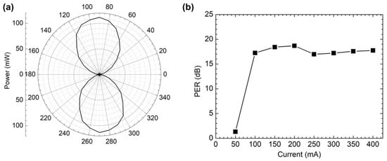 Previous studies have shown that femtosecond laser point-by-point writing FBG has birefringence [,], which may lead to linearly polarized laser output. To verify this phenomenon, the polarization extinction ratio (PER) of the laser is characterized. A linear polarization controller (Thorlabs, FBR-LPNIR), adjustable fiber-to-fiber coupler (Thorlabs, FBP-C-FC) and power detector are used to test the polarization characteristics of the lasers. By carefully rotating the polarization controller for one cycle and recording the change in power passing through the polarization controller, a polar diagram of the output power and rotation angle is obtained, as shown in Figure 5a. The measured maximum power Pmax and minimum power Pmin are 113.56 mW and 1.91 mW under 400 mA, which give a PER value exceeding 17.74 dB. (). The PER value at different currents is shown in Figure 5b. The TE and TM modes are not lasing at 50 mA which is below the threshold current. The difference of the power level between TE mode and TM mode is small, and the PER is low. The maximum PER value is 18.68 dB. It should be noted that the laser output fiber is a single-mode fiber, but it still shows linear polarization performance. This is due to the birefringence characteristics introduced by the femtosecond laser writing asymmetric refractive index modulation structure. Higher PER probably obtained if Fs-apodized FBG is written in the polarization-maintaining fiber, which is also part of the subsequent work.