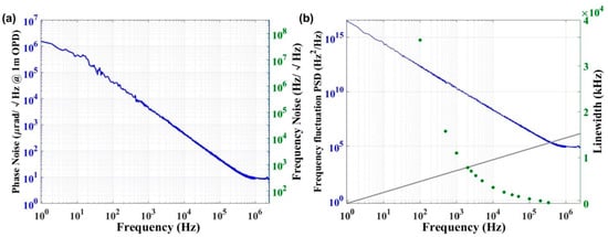 Figure 6a shows the PSD of a 1030 nm semiconductor laser, and Figure 6b evaluates the laser linewidth in the full Fourier frequency range by integrating the frequency noise fluctuation PSD based on the β isolation line method. The white noise platform is 82,960 Hz2/Hz@2 MHz for the 1030 nm laser, the corresponding Lorentzian linewidth is 260.5 kHz, and the minimum integral linewidth is 180.4 kHz. The minimum Lorentzian and integral linewidth of the 1080 nm laser are 309.3 kHz and 208.4 kHz, respectively. The difference in the minimum linewidth between the two lasers is affected by the cleavage of the fiber. The cleavage of the fiber is an interesting research direction for narrowing the laser linewidth in future studies. In addition, the integrated linewidth obtained at the intersection of the β-separation line and the frequency noise spectrum is close to the Lorentzian linewidth; the β-separation line does not consider the Fourier limit and gives very optimistic results in the case of the shortest time [].