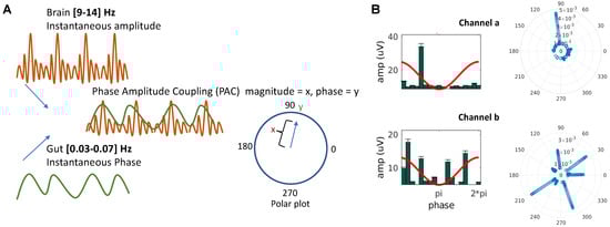 Phase Amplitude Coupling (PAC). (A) Illustration for computing PAC with instantaneous amplitude of the fast frequency EEG signal and instantaneous phase of the slow frequency EGG signal, and polar plot representation of the resultant coupling mean vector magnitude (x) at phase (y) (B) Illustrative examples of high coupling at phase ~100 degrees (top), and dispersed coupling spread over various phases (bottom).
