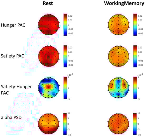 During both hunger and satiety states, in both cognitive conditions, we found the strongest PAC in the fronto-central and occipital areas. Significant differences in the PAC between hunger and satiety states were largest in the central area at rest and in frontal regions during the working memory task (Figure 4). Moreover, PAC topographies did not completely overlap with the alpha PSD topographies, averaged for hunger and satiety states, shown in the last row of Figure 4. For instance, the alpha PSD did not show any significant differences between hunger and satiety whereas substantial differences were seen with PAC activations.