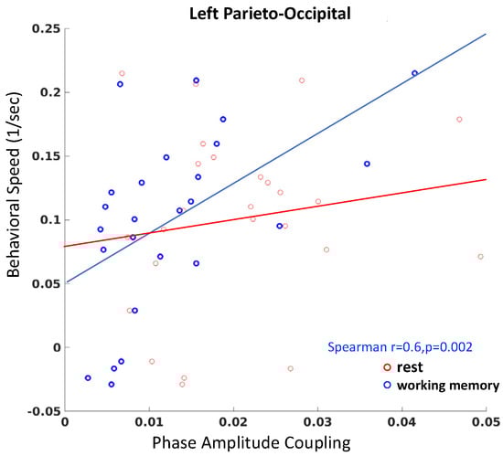 We next considered whether individual differences in gut-brain coupling relate to behavioral performance on a working memory task. In particular, we measured the behavioral speed or 1/response time in our adaptive behavioral task (wherein performance accuracy is adaptively controlled) as a function of gut-brain PAC. We found there is a significant relationship to working memory speed only in the left parieto-occipital region (Spearman r = 0.60, p = 0.002, FWER corrected for multiple comparisons across 4 brain regions, Figure 6, blue) after partially controlling for the satiety level; no such correlations were found at rest (Figure 6, red).
